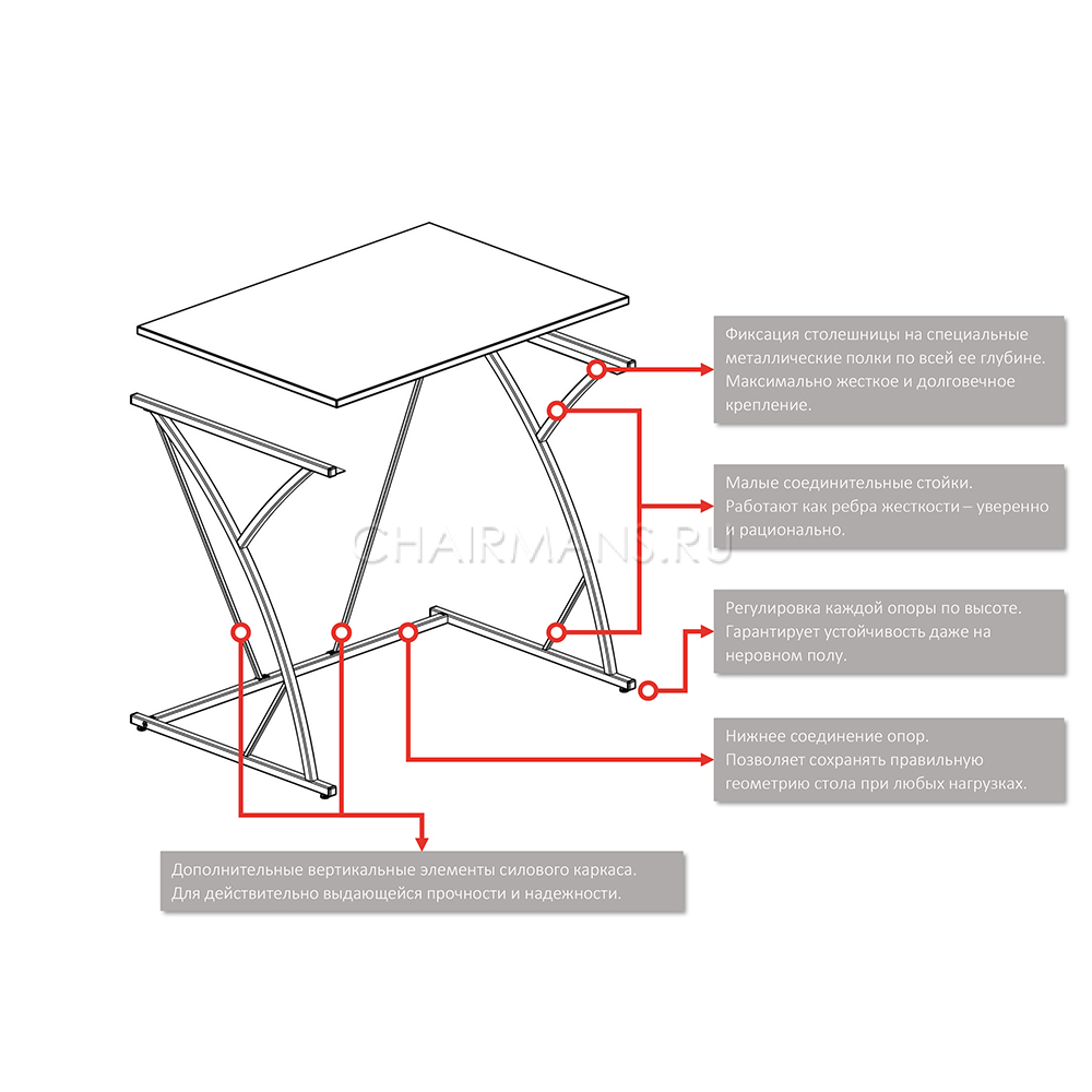Регулировка каждой опоры по высоте. Гарантирует устойчивость даже на неровном полу.