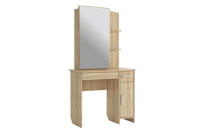 Трюмо «Виктория 1» выполнено в цвете дуб сонома. Полки для парфюмерии и косметики, ящики для украшений, фена и мелочей.